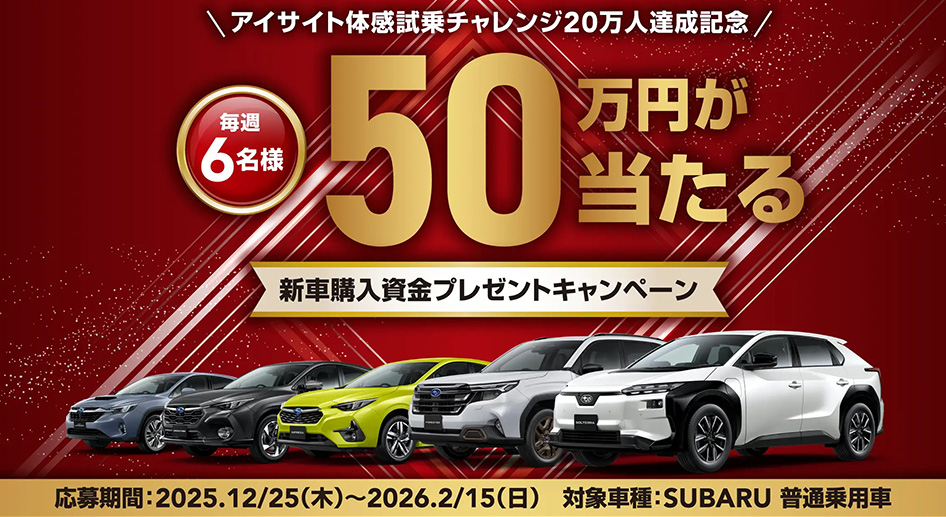 【キャンペーン概要】SUBARU 新車購入資金プレゼント SUBARUの普通乗用車(新車)をご検討中の方を対象に、抽選で新車購入資金が当たるキャンペーンです。 ■ 特典内容 新車購入資金 50万円(税込) 当選数:毎週抽 …