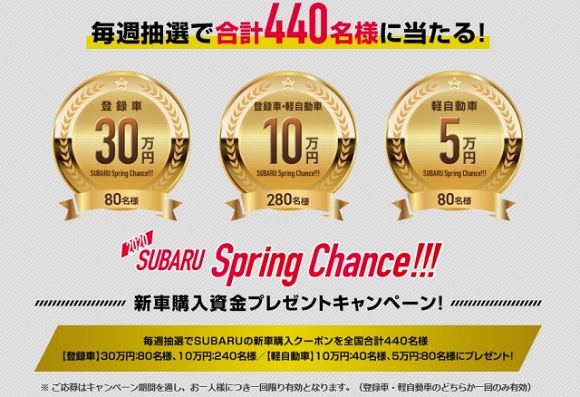 期間中、毎週抽選が行われ登録車で最大30万円、軽自動車では最大10万円、