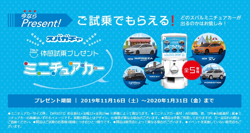 全5種のうち何が当たるのかはSUBARUオリジナルガチャ、その名も『スバガチャ』を回してのお楽しみ!!